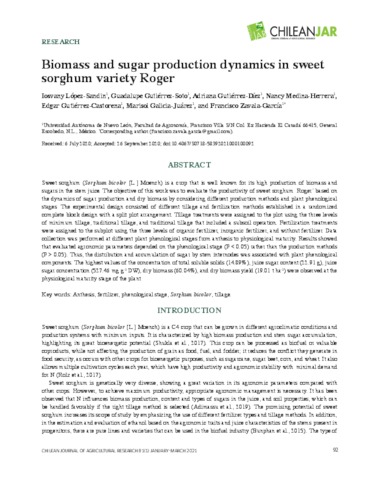 López Sandin, Iosvany y Gutiérrez Soto, Guadalupe y Gutiérrez Díez, Adriana y Medina Herrera, Nancy y Gutiérrez Castorena, Edgar y Galicia Juárez, Marisol y Zavala García, Francisco (2021) Biomass and sugar production dynamics in sweet sorghum variety Roger. Chilean journal of agricultural research, 81 (1). pp. 92-101. ISSN 0718-5839