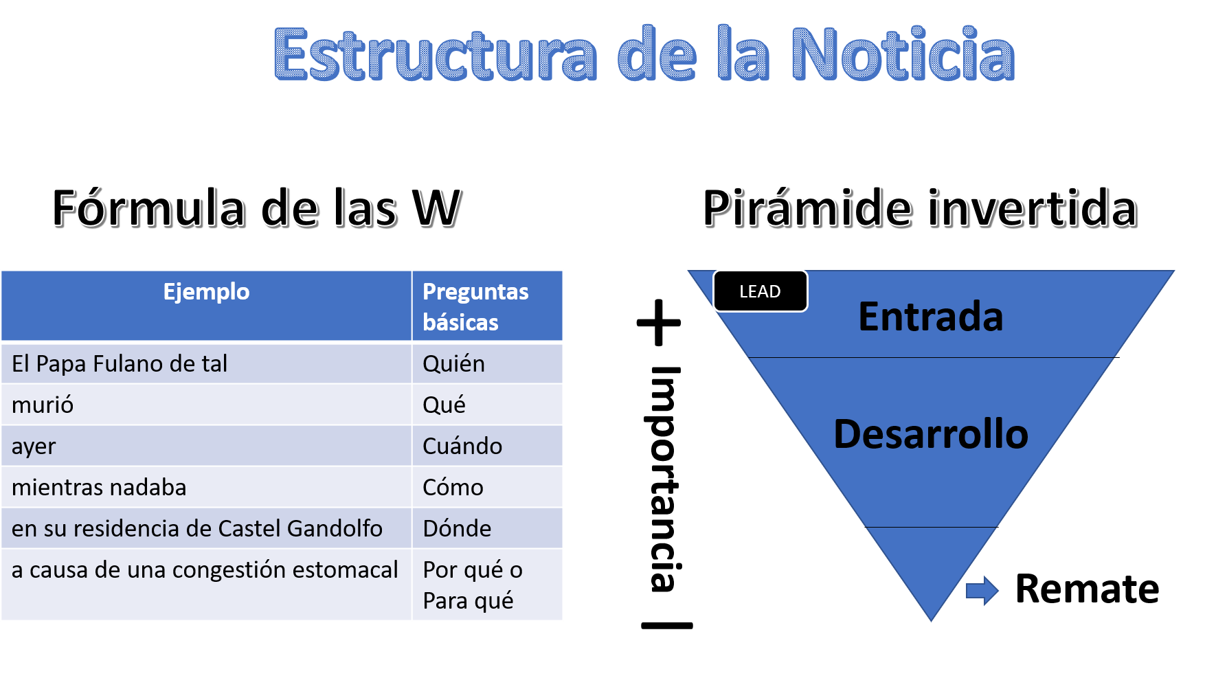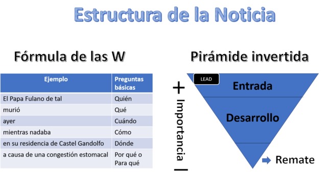Apoyo visual de la Formula de las W en el periodismo y el esquema de pirámide invertida dentro de la estructura de la Noticia