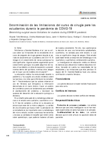 Tello Mendoza, Ricardo y Maldonado Garza, Cristina y Martinez Garza, Javier H. y Elizondo Omaña, Rodrigo E. y Quiroga Garza, Alejandro (2023) Determinación de las limitaciones del curso de cirugía para los estudiantes durante la pandemia de COVID-19. Cirugía y Cirujanos, 91 (6). pp. 858-859. ISSN 0009-7411