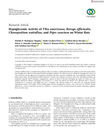 Rodríguez Magaña, Martha P. y Cordero Pérez, Paula y Rivas Morales, Catalina y Oranday Cárdenas, María A. y Moreno Peña, Diana P. y García Hernández, David G. y Leos Rivas, Catalina (2019) Hypoglycemic Activity of Tilia americana, Borago officinalis, Chenopodium nuttalliae, and Piper sanctum on Wistar Rats. Journal of Diabetes Research, 2019. pp. 1-6. ISSN 2314-6745
