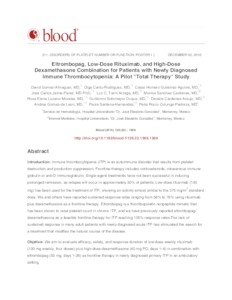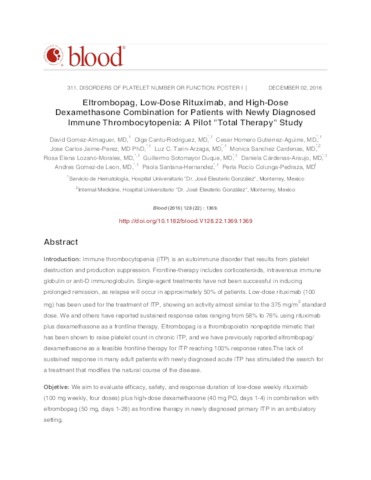 Gómez Almaguer, David y Cantú Rodríguez, Olga Graciela y Gutiérrez Aguirre, César Homero y Jaime Pérez, José Carlos y Tarin Arzaga, Luz C. y Sánchez Cárdenas, Mónica y Lozano Morales, Rosa Elena y Sotomayor Duque, Guillermo y Cárdenas Araujo, Daniela y Gómez de León, Andrés y Santana Hernández, Paola y Colunga Pedraza, Perla Rocío (2016) Eltrombopag, Low-Dose Rituximab, and High-Dose Dexamethasone Combination for Patients with Newly Diagnosed Immune Thrombocytopenia: A Pilot "Total Therapy" Study. Blood, 128 (22). p. 1369. ISSN 0006-4971