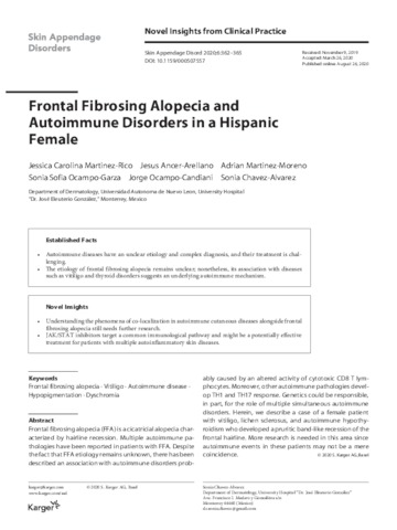 Martinez Rico, Jessica Carolina y Ancer Arellano, Jesus y Martínez Moreno, Adrián y Ocampo Garza, Sonia Sofía y Ocampo Candiani, Jorge y Chávez Álvarez, Sonia (2020) Frontal Fibrosing Alopecia and Autoimmune Disorders in a Hispanic Female. Skin Appendage Disorders, 6 (6). pp. 362-365. ISSN 2296-9195