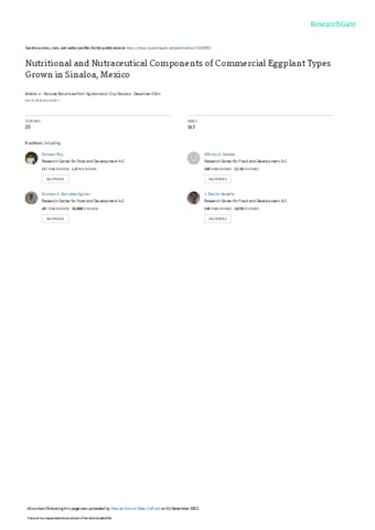 Niño Medina, Guillermo y Muy Rangel, Dolores y Gardea Bejar, Alfonso y González Aguilar, Gustavo y Heredia, Basilio y Báez Sañudo, Manuel y Siller Cepeda, Jorge y Vélez de la Rocha, Rosabel (2014) Nutritional and Nutraceutical Components of Commercial Eggplant Types Grown in Sinaloa, Mexico. Notulae Botanicae Horti Agrobotanici Cluj-Napoca, 42 (2). pp. 538-544. ISSN 0255-965X