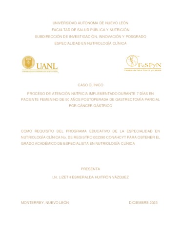 Huitrón Vázquez, Lizeth Esmeralda (2023) Proceso de atención nutricia implementado durante 7 días en paciente femenino de 50 años postoperada de gastrectomía parcial por cáncer gástrico. Especialidad thesis, Universidad Autónoma de Nuevo León.