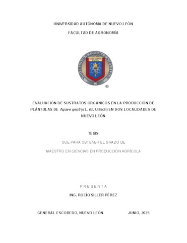 Siller Pérez, Rocío (2025) Evaluación de sustratos orgánicos en la producción de plántulas de Agave gentryi L. (B. Ullrich) en dos localidades de Nuevo León. Maestría thesis, Universidad Autónoma de Nuevo León.