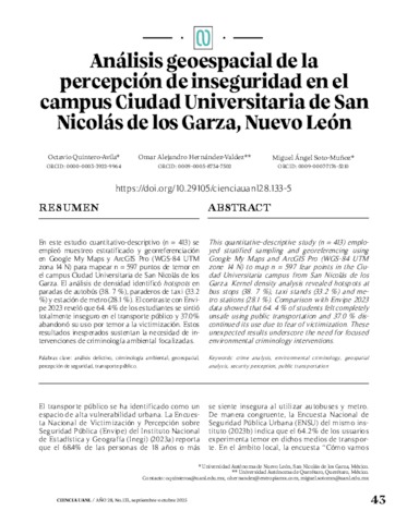 En este estudio cuantitativo-descriptivo (n = 413) se empleó muestreo estratificado y georreferenciación en Google My Maps y ArcGIS Pro (WGS-84 UTM zona 14 N) para mapear n = 597 puntos de temor en el campus Ciudad Universitaria de San Nicolás de los Garza. El análisis de densidad identificó hotspots en paradas de autobús (38. 7 %), paraderos de taxi (33.2 %) y estación de metro (28.1 %). El contraste con Envi-pe 2023 reveló que 64. 4% de los estudiantes se sintió totalmente inseguro en el transporte público y 37.0% abandonó su uso por temor a la victimización. Estos resultados inesperados sustentan la necesidad de in-tervenciones de criminología ambiental focalizadas