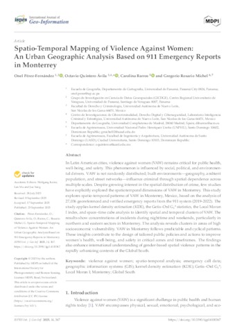 Pérez-Fernández, Onel y Quintero Ávila, Octavio y Barros, Carolina y Rosario Michel, Gregorio (2025) Spatio-Temporal Mapping of Violence Against Women: An Urban Geographic Analysis Based on 911 Emergency Reports in Monterrey. ISPRS International Journal of Geo-Information, 14. ISSN 2220-9964