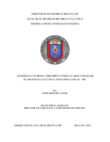 Moreno Cerda, David (2025) Desarrollo de modelo matemático para la caracterización de un vehículo eléctrico a baterías clase VI – VIII. Maestría thesis, Universidad Autónoma de Nuevo León.