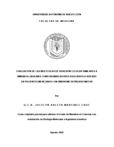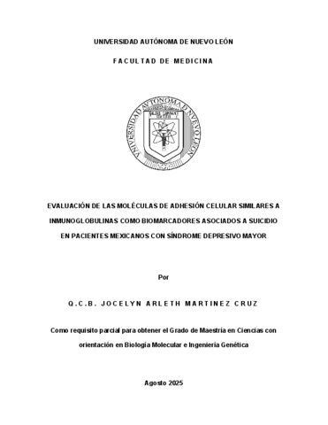 Martínez Cruz, Jocelyn Arleth (2025) Evaluación de las moléculas de adhesión celular similares a inmunoglobulinas como biomarcadores asociados a suicidio en pacientes mexicanos con síndrome depresivo mayor. Maestría thesis, Universidad Autónoma de Nuevo León.