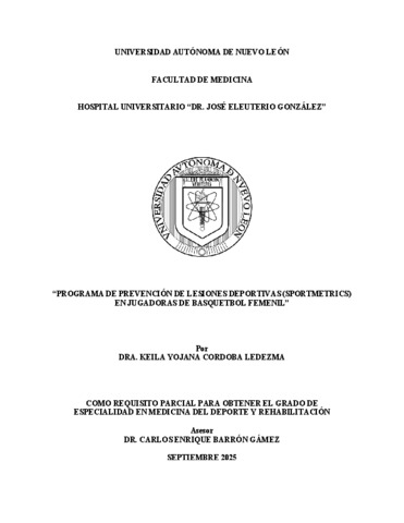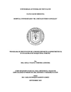 Córdoba Ledezma, Keila Yojana (2025) Programa de prevención de lesiones deportivas (sportmetrics) en jugadoras de basquetbol femenil. Especialidad thesis, Universidad Autónoma de Nuevo León.