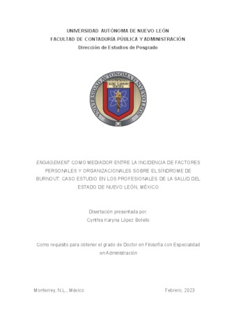 López Botello, Cynthia Karyna (2023) Engagement como mediador entre la incidencia de factores personales y organizacionales sobre el Síndrome de Burnout: Caso estudio en los profesionales de la salud del estado de Nuevo León, México. Doctorado thesis, Universidad Autónoma de Nuevo León.