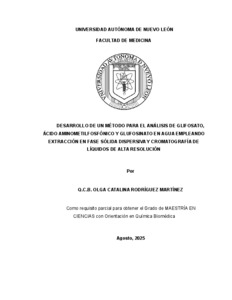 Rodríguez Martínez, Olga Catalina (2025) Desarrollo de un método para el análisis de glifosato, ácido aminometilfosfónico y glufosinato en agua empleando extracción en fase sólida dispersiva y cromatografía de líquidos de alta resolución. Maestría thesis, Universidad Autónoma de Nuevo León.