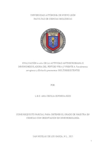 Espinosa Ríos, Ana Cecilia (2025) Evaluación in vitro de la actividad antimicrobiana e inmunomoduladora del péptido WB14_F frente a Pseudomonas aeruginosa y Klebsiella pneumoniae multirresistentes. Maestría thesis, Universidad Autónoma de Nuevo León.