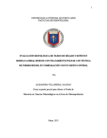 Villarreal Salinas, Alejandra (2025) Evaluación histológica de tejido de hígado y riñón en modelo animal murino con tratamiento pulpar con técnica de formocresol en comparación con un grupo control. Maestría thesis, Universidad Autónoma de Nuevo León.