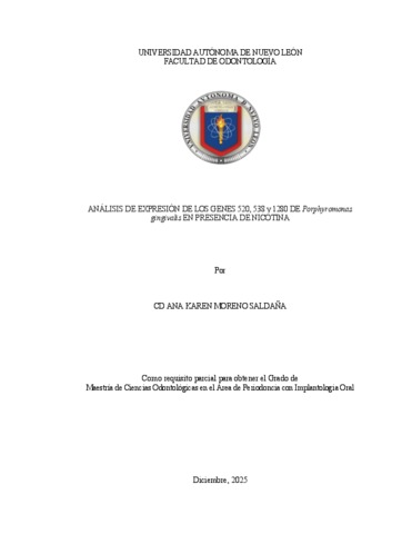 Moreno Saldaña, Ana Karen (2025) Análisis de expresión de los genes 520, 538 y 1280 de Porphyromonas gingivalis en presencia de nicotina. Maestría thesis, Universidad Autónoma de Nuevo León.
