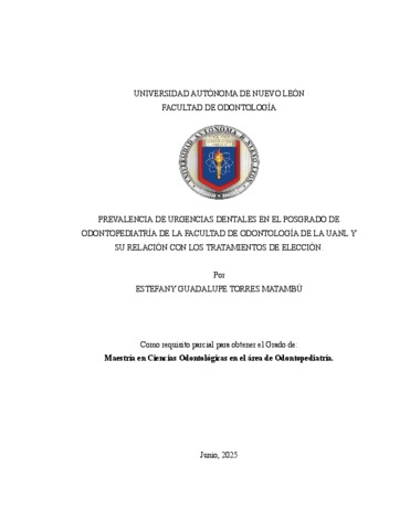 Torres Matambú, Estefany Guadalupe (2025) Prevalencia de urgencias dentales en el posgrado de odontopediatría de la Facultad de Odontología de la UANL y su relación con los tratamientos de elección. Maestría thesis, Universidad Autónoma de Nuevo León.