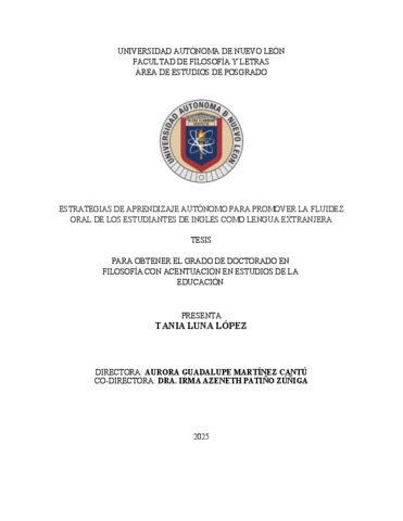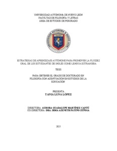Luna López, Tania (2025) Estrategias de aprendizaje autónomo para promover la fluidez oral de los estudiantes de inglés como lengua extranjera. Doctorado thesis, Universidad Autónoma de Nuevo León.