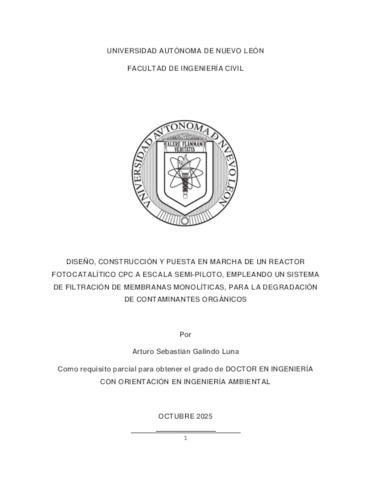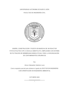 Galindo Luna, Arturo Sebastian (2025) Diseño, construcción y puesta en marcha de un reactor fotocatalítico CPC a escala semi-piloto, empleando un sistema de filtración de membranas monolíticas, para la degradación de contaminantes orgánicos. Doctorado thesis, Universidad Autónoma de Nuevo León.