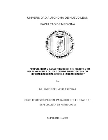 Véliz Escobar, José Fidel y Guerrero González, Elisa María (2025) Prevalencia y caracterización del prurito y su relación con la calidad de vida en pacientes con enfermedad renal crónica en hemodialisis. Especialidad thesis, Universidad Autónoma de Nuevo León.