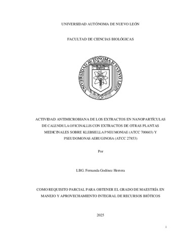 Godinez Herrera, Fernanda (2025) Actividad antimicrobiana de los extractos en nanopartículas de Calendula oficinallis con extractos de otras plantas medicinales sobre Klebsiella pneumoniae (ATCC 700603) y Pseudomonas aeruginosa (ATCC 27853). Maestría thesis, Universidad Autónoma de Nuevo León.