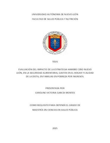 García Montes, Caroline Victoria (2025) Evaluación del impacto de la estrategia Hambre Cero Nuevo León, en la seguridad alimentaria, gastos en el hogar y calidad de la dieta, en familias en pobreza por ingresos. Maestría thesis, Universidad Autónoma de Nuevo León.