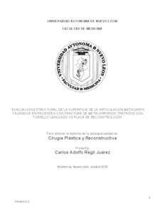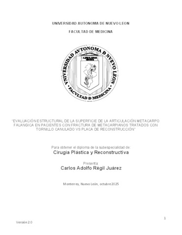 Régil Juárez, Carlos Adolfo (2025) Evaluación estructural de la superficie de la articulación metacarpo falangica en pacientes con fractura de matacarpainos tratados con tornillo canulado vs placa de reconstrucción. Especialidad thesis, Universidad Autónoma de Nuevo León.