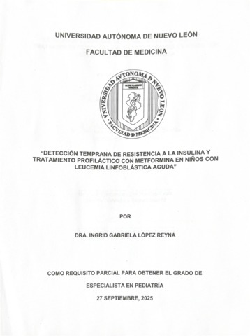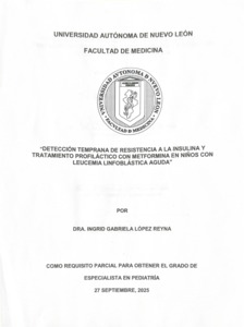 López Reyna, Ingrid Gabriela (2025) Detección temprana de resistencia a la insulina y tratamiento profiláctico con metformina en niños con leucemia linfoblástica aguda. Especialidad thesis, Universidad Autónoma de Nuevo León.
