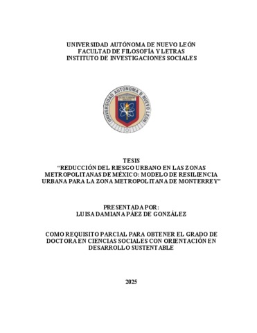 Páez de González, Luisa Damiana (2025) Reducción del riesgo urbano en las zonas metropolitanas de México: modelo de resiliencia urbana para la Zona Metropolitana de Monterrey. Doctorado thesis, Universidad Autónoma de Nuevo León.