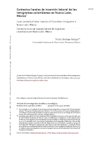Bedoya Rangel, Yuliet (2025) Contextos locales de inserción laboral de las inmigrantes colombianas en Nuevo León, México. Revista Colombiana de Sociología, 48 (1). pp. 313-342. ISSN 2256-5485
