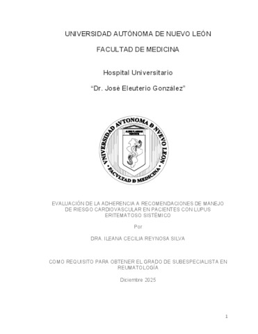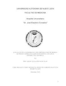 Reynosa Silva, Ileana Cecilia (2025) Evaluación de la adherencia a recomendaciones de manejo de riesgo cardiovascular en pacientes con lupus eritematoso sistémico. Especialidad thesis, Universidad Autónoma de Nuevo León.