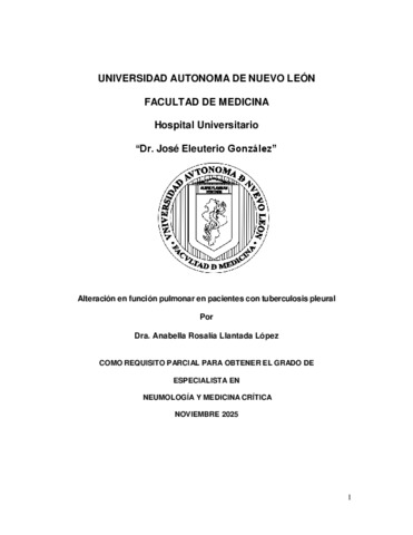 Llantada Lopéz, Anabella Rosalia (2025) Alteración de función pulmonar en pacientes con tuberculosis pleural. Especialidad thesis, Universidad Autónoma de Nuevo León.