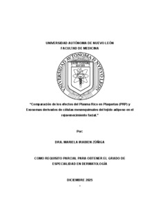 Irabien Zuñiga, Mariela (2025) Comparación de los efectos del Plasma Rico en Plaquetas (PRP) y Exosomas derivados de células mesenquimales del tejido adiposo en el rejuvenecimiento facial. Especialidad thesis, Universidad Autónoma de Nuevo León.