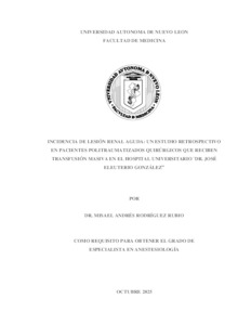 Rodríguez Rubio, Misael Andrés (2025) Incidencia de lesión renal aguda: un estudio retrospectivo en pacientes politraumatizados quirúrgicos que reciben transfusión masiva en el Hospital Universitario "Dr. José Eleuterio González". Especialidad thesis, Universidad Autónoma de Nuevo León.