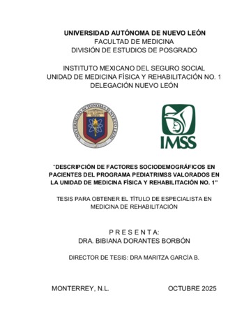 Dorantes Borbón, Bibiana y NO ESPECIFICADO (2025) Descripción de factores sociodemográficos en pacientes del programa Pediatrimss valorados en la unidad de medicina física y rehabilitación NO.1. Especialidad thesis, Universidad Autónoma de Nuevo León.