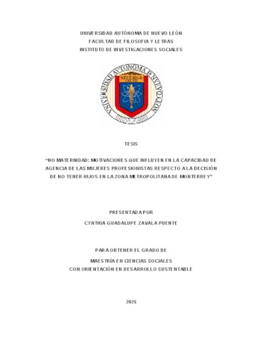 Zavala Puente, Cynthia Guadalupe (2025) No maternidad: motivaciones que influyen en la capacidad de agencia de las mujeres profesionistas respecto a la decisión de no tener hijos en la Zona Metropolitana de Monterrey. Maestría thesis, Universidad Autónoma de Nuevo León.