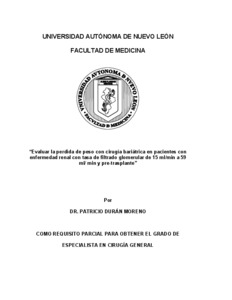 Evaluar la perdida de peso con cirugía bariátrica en pacientes con enfermedad renal con tasa de filtrado glomerular de 15 ml/min a 59 ml/min y pretransplante.
