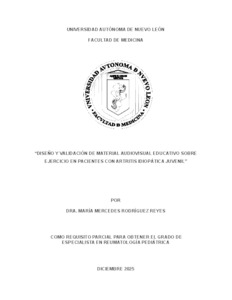 Rodríguez Villarreal, María Mercedes (2025) Diseño y validación de material audiovisual educativo sobre ejercicio en pacientes con artritis idiopática juvenil. Especialidad thesis, Universidad Autónoma de Nuevo León.