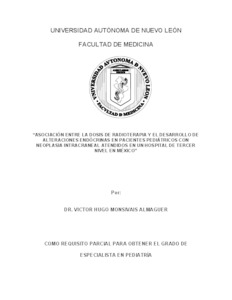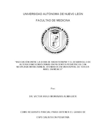 Monsivais Almaguer, Victor Hugo (2025) Asociación entre la dosis de radioterapia y el desarrollo de alteraciones endócrinas en pacientes pediátricos con neoplasia intracraneal atendidos en un hospital de tercer nivel en México. Especialidad thesis, Universidad Autónoma de Nuevo León.