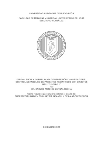 Bernal Rocha, Carlos Antonio (2025) Prevalencia y correlación de depresión y ansiedad en el control metabólico de pacientes pediátricos con diabetes mellitus tipo I. Especialidad thesis, Universidad Autónoma de Nuevo León.