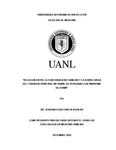 García Aguilar, Joaquin Elias (2025) Relación entre la funcionalidad familiar y la sobrecarga del cuidador principal informal de personas con síndrome de Down. Especialidad thesis, Universidad Autónoma de Nuevo León.