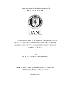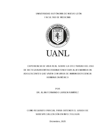 Larsen Ramírez, Alan Fernando (2025) Experiencia de vida real sobre la efectividad del uso de bictegravir/emtricitabina/tenofovir alafenamida en adolescentes que viven con virus de inmunodeficiencia humana en México. Especialidad thesis, Universidad Autónoma de Nuevo León.