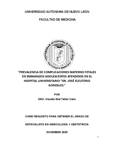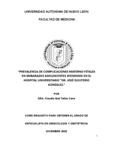 Tellez Cano, Claudia Itzel (2025) Prevalencia de complicaciones materno fetales en embarazos adolescentes atendidos en el hospital universitario "Dr. José Eleuterio González". Especialidad thesis, Universidad Autónoma de Nuevo León.