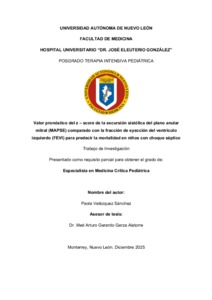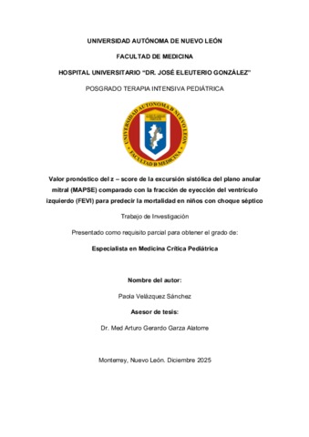 Velázquez Sánchez, Paola (2025) Valor pronóstico del z – score de la excursión sistólica del plano anular mitral (MAPSE) comparado con la fracción de eyección del ventrículo izquierdo (FEVI) para predecir la mortalidad en niños con choque séptico. Especialidad thesis, Hospital universitario Jose Eleuterio González.