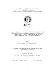 Estrada Renteria, Andrea (2025) Relación entre la detección de potenciales donantes de órganos en el departamento de emergencias shock-trauma con la tasa de donación del hospital universitario Dr. José Eleuterio González. Especialidad thesis, Universidad Autonoma De Nuevo León.