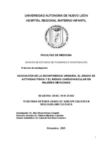 Dimas Campillo, Alan Ulises (2025) Asociación de la incontinencia urinaria, el grado de actividad física y el riesgo cardiovascular en mujeres mexicanas. Especialidad thesis, Universidad Autónoma de Nuevo León.