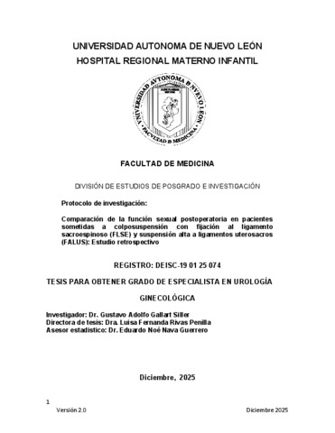 Gallart Siller, Gustavo Adolfo (2025) Comparación de la función sexual postoperatoria en pacientes sometidas a colposuspensión con fijación al ligamento sacroespinoso (FLSE) y suspensión alta a ligamentos uterosacros (FALUS): Estudio retrospectivo. Especialidad thesis, Universidad Autónoma de Nuevo León.