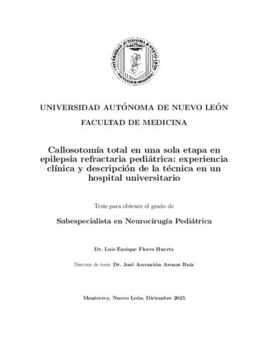 Flores Huerta, Luis Enrique (2025) Callosotomía total en una sola etapa en epilepsia refractaria pediátrica: experiencia clínica y descripción de la técnica en un hospital universitario. Especialidad thesis, Universidad Autonoma de Nuevo Leon.