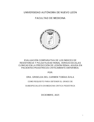 Tobías Ávila, Griselda del Carmen (2025) Evaluación comparativa de los índices de resistencia y pulsatilidad renal versus escalas clínicas en la predicción de lesión renal aguda en pacientes pediátricos críticamente enfermos. Especialidad thesis, Universidad Autónoma de Nuevo León.