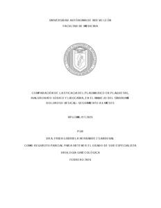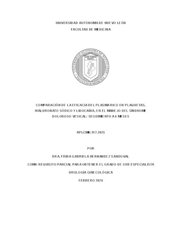 Hernandez Sandoval, Frida Gabriela (2025) Comparación de la eficacia del plasma rico en plaquetas, hialuronato sódico y lidocaína, en el manejo del síndrome doloroso vesical: seguimiento a 6 meses. Especialidad thesis, Universidad Autonoma de Nuevo Leon.