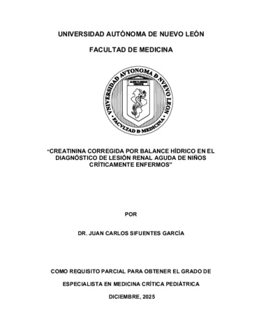 Sifuentes García, Juan Carlos (2025) Creatinina corregida por balance hídrico en el diagnóstico de lesión renal aguda de niños críticamente enfermos. Especialidad thesis, Universidad Autónoma de Nuevo León.